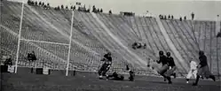 In the third week of the 1932 season, Michigan faced Ohio State, the only team to defeat Michigan in 1931. Michigan won, 14–0, on the strength of Harry Newman's passing. Michigan's first touchdown came early in the first quarter, following a 12-yard punt by Ohio State. Taking over at the Ohio State 30-yard line, Newman passed to Herman Everhardus at the 15-yard line. Newman then threw to John Regeczi for the touchdown. In the second quarter, Newman threw a second touchdown pass to Ivy Williamson "who was standing unguarded near the goal line."[14] Newman converted both PATs. Michigan executed a defensive strategy in the second half, seeking to preserve its 14–0 lead. Early in the third quarter, Stanley Fay prevented a touchdown, knocking the ball out of the hands of an Ohio State receiver in the end zone. Regeczi also intercepted a pass, and Michigan's defense held on several drives deep into Michigan territory. The win proved costly, as two of Michigan's halfbacks were injured in the game. Stanley Fay sustained cracked ribs and missed the next three games.[14][15] Jack Heston, the son of Willie Heston, fractured a bone in his right leg and was lost for the season.[16]
