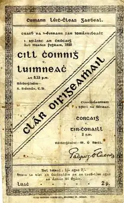 The 1933 All-Ireland Senior Hurling Championship Final was the 46th All-Ireland Final and the culmination of the 1933 All-Ireland Senior Hurling Championship, an inter-county hurling tournament for the top teams in Ireland. The match was held at Croke Park, Dublin, on 3 September 1933, between Limerick and Kilkenny. The Munster champions lost to their Leinster opponents on a score line of 1–7 to 0–6.[1]