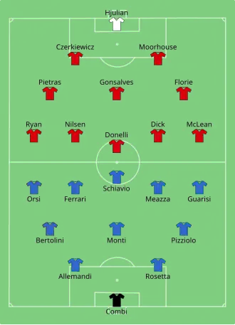 A torrential downpour hampered the Austrians' passing game while benefiting the more varied Italian game. Italy took the lead when a ball broke free from the Austrian goalkeeper because of an intervention by Giuseppe Meazza. The ball then hit the post and was turned into goal by a perfectly positioned Enrique Guaita. In the second half, Austrian efforts to equalize were stopped by Gianpiero Combi, and Italy managed to hold on for the victory.[2]
