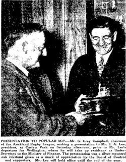 It was decided to begin the season on the 18th of April and a "substantial portion" of the gate would be donated to Jim Laird, the Marist player who was still recovering from an injury received playing for New Zealand the previous season. Senior premiership matches would start on May 2.[5] On September 12 during the break between Roope Rooster games at Carlaw Park John A. Lee was presented with a silver mounted oak inkstand by officials of Auckland Rugby League. Lee was an M.P. and was being elevated to Parliamentary Under-Secretary in charge of the State housing scheme. This required him to spend a lot more time in Wellington and he would be relinquishing the presidency of Auckland Rugby League at the end of the season. Lee said "I love the game and I like the people associated with it"... "what ever can do for the league code will be done, not because of politics, but because I love league football".