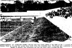 At the February 26 meeting of the ARL the board agreed to erect higher goal posts at Carlaw Park. They also decided to make permanent accommodation there for the Mount Albert United Club.[1] Chairman Campbell at the pre-season ARL meeting said that the ground space had extended the ground space by 12 feet in width by the setting back of the picket fence at the foot of the terrace which meant "the danger of players being thrown against the terrace fence had been greatly minimised".[8] They had also formed steps behind the stand leading to the hill. The turf has also been top dressed, and made more even than it had formerly been. It was also discussed that a round of night games in early April could be played and this was supported by several delegates.[9][10] A by-law had come into place whereby "theatres and other places of amusement capable of seating 500 or more people" would have to have firemen in attendance. In the past the by-law did not operate in regards to sports organisations. From May 1 firemen would be supplied directly by the Auckland Metropolitan Fire Board.[11] New Zealand was transitioning to a 40-hour work week meaning that many people would no longer be working half days on Saturday. Mr. G. Grey Campbell said if Saturday were a universal holiday the league would "undoubtedly take full advantage of it. Reserve grade games might well be played in the morning. Furthermore, opportunity could be taken to have senior B matches played on Saturday morning at Carlaw Park" which had been a difficulty up to this point.[12] The grounds executive submitted a report to the board that a start had been made by May 20 on the formation of tea rooms near the grandstand as part of the programme of improvements in preparation for the visit of the British team.[13] It was reported at the May 27 meeting of the board of control that Mr. Early had donated a board for display at Carlaw Park which would show the senior team placings in the competition from week to week. It was reported at the same meeting that after 4 rounds the gate takings were far in excess of anything since 1931.[14] It was decided at a meeting on June 1 to purchase special whistles for referees on the #2 field because there was sometimes confusion when a whistle was blown as to which field it related to.[15]
