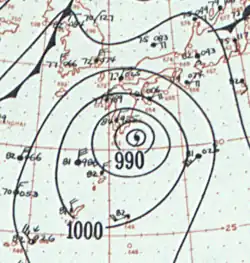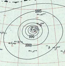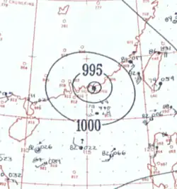 Also on September 2, a tropical depression formed between Guam and Luzon. It moved to the northwest, then turned to the northeast, intensifying into a typhoon; this was based on a pressure reading of 993 mbar (29.3 inHg) from a nearby ship. On September 6, the system dissipated.[34][40]