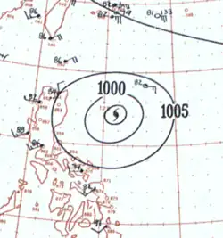 On December 3, a tropical depression formed about 485 km (300 mi) east of Yap. Tracking westward, it intensified into a typhoon on December 5 while approaching the Philippines. The system turned to the northwest, moving over eastern Samar and crossing Catanduanes island with a recorded pressure of 992 mbar (29.3 inHg). Subsequently, there is contradictory information on the path; the storm either continued to the northwest, dissipating over northeastern Luzon on December 8, or it turned to the southwest. Capalonga in eastern Luzon reported a pressure of 989 mbar (29.2 inHg) on December 8, and later, a station on Marinduque island reported a pressure of 987 mbar (29.1 inHg). The Monthly Weather Report tracked the storm over the Philippines into the South China Sea, reporting its dissipation on December 13 to the east of Vietnam.[62][65] Across its path through the Philippines, the typhoon brought heavy rains and strong winds, which downed trees and power lines.[62] On Catanduanes, the storm left about 75,000 people homeless,[66] and killed 60. At Labo, Camarines Norte, ten people died when a tree fell onto a house. Another three people drowned between Polillo Island and Camarines Norte.[62]