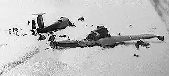 The aircraft based from USS Pine Island (AV-12),[2] Bureau Number 59098, callsign "George 1", hit a ridge and burned while supporting Operation Highjump.[2] The crash instantly killed Ensign Maxwell A. Lopez and Petty Officer Wendell K. Hendersin.[2] Two hours later, Petty Officer Frederick Williams also died.[2] Six crewmembers survived the crash, Aviation Radioman James H. Robbins, pilot Ralph "Frenchy" LeBlanc, co-pilot William Kearns, photographer Owen McCarty, Plane Captain J.D. Dickens, and Pine Island Captain H.H. Caldwell, a guest observer on the flight. They were rescued 13 days later by an aircraft from Pine Island. LeBlanc was so frostbitten from the conditions that both of his legs were amputated to avoid gangrene spreading past his knee joints.[3] His legs were amputated on the Philippine Sea, a ship that was part of the rescue, and one of his arms was later surgically grafted to his face to repair frostbitten facial tissue in a Rhode Island naval hospital.[4] Hendersin, Williams, and Lopez were buried at the crash site and their remains have not been recovered.[1][2]