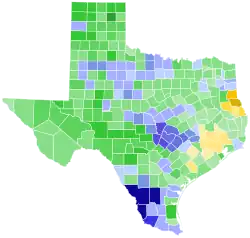 Primary results by county. Johnson counties appear in blue, Stevenson counties in green, and Peddy counties in yellow.[58]