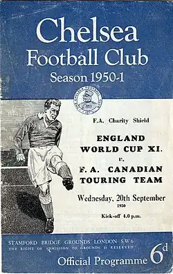 England had entered the FIFA World Cup for the first time in 1950, having previously missed the tournament due to the FA (and other Home Nations football associations) boycott of FIFA.[2] The tournament had gone badly, with an under-prepared England team eliminated in the first round, including suffering from a 1–0 defeat to the United States, whose team was largely made up of amateurs.[3] The decision to send a team on a goodwill tour — a fairly common practice by the FA at the time[4] — to Canada at the same time as the World Cup is now seen as evidence of this poor preparation, with key players such as Stanley Matthews and Nat Lofthouse unavailable for all or part of the World Cup due to their selection for the tour.[5] This was the last time to date that the Charity Shield was held between two FA teams (in 1913, 1923–26 and 1929 it had been between an England Professional XI and the England amateur team), though an FA XI would later compete in the 1961 FA Charity Shield against the double-winning Tottenham Hotspur team.