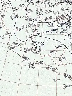 A trough formed over southern Florida on June 17. Early the next day, a circulation formed, signaling that a tropical depression also developed over the Everglades. The system moved slowly north-northeastward, emerging into the western Atlantic Ocean at 06:00 UTC on June 20. Shortly thereafter, the depression intensified into a tropical storm, although the structure was broad and asymmetric due to association with a nearby upper-level low, signaling that the system was possibly a subtropical cyclone. Ship reports in the region indicate that the storm continued to intensify. On June 22, the structure became much more symmetrical while passing just off the Outer Banks, bringing winds of 33 mph (53 km/h) to Wilmington, North Carolina. That day, the Hurricane Hunters estimated winds of 80 mph (130 km/h), and is possible that the storm briefly attained hurricane status. The peak winds were estimated at 70 mph (110 km/h), due to a pressure reading of 994 mbar (29.4 inHg). The storm accelerated northeastward due to an approaching cold front. On June 24, the storm became extratropical, and shortly thereafter made landfall along southwestern Nova Scotia. The system dissipated the next day over the northern Gulf of Saint Lawrence.[11]