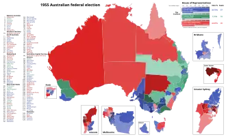 The 1955 Australian federal election was held in Australia on 10 December 1955. All 122 seats in the House of Representatives and 30 of the 60 seats in the Senate were up for election. An early election was called to bring the House and Senate elections back in line; the previous election in 1954 had been House-only. The incumbent Liberal–Country coalition led by Prime Minister Robert Menzies increased its majority over the opposition Labor Party, led by H. V. Evatt.