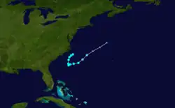 A low-pressure area formed along a dissipating cold front to the north of Puerto Rico. The system moved westward, developing some tropical characteristics by October 13.[5] The next day, the system became a tropical storm over the Straits of Florida.[9] On October 15, it crossed over South Florida near Homestead with winds of 60 mph (95 km/h).[5] While it is unclear whether this cyclone ever became fully tropical, it is entered into HURDAT as a tropical cyclone.[3] The storm intensified further over the Florida peninsula, peaking at 65 mph (105 km/h) early on October 16.[9] After affecting Florida, the storm crossed the western Atlantic and moved across the Outer Banks.[5] The storm became extratropical on October 17, and the next day it was absorbed by another extratropical storm.[19]
