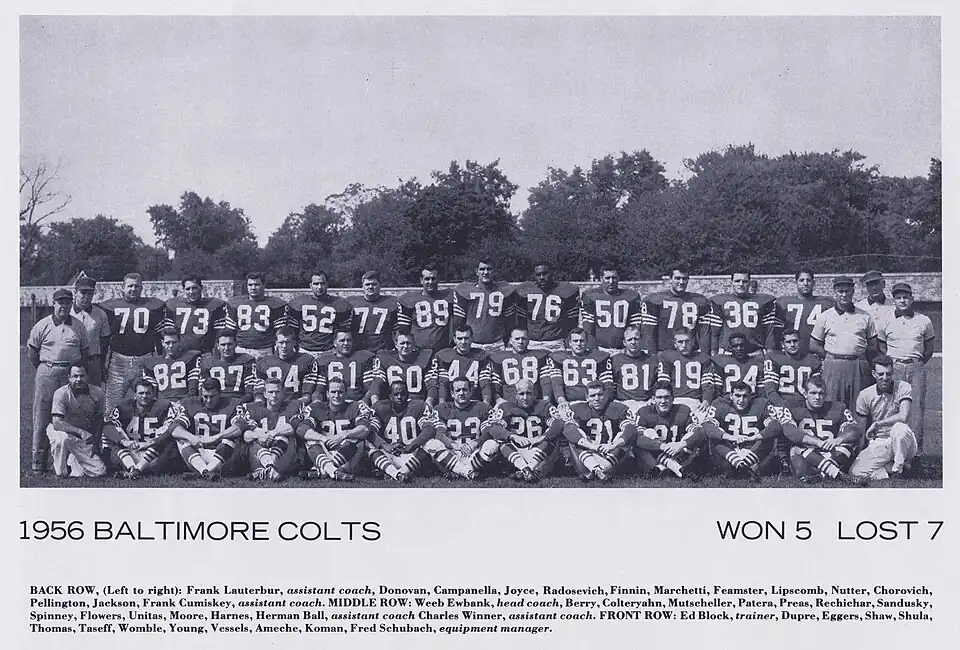 The 1956 Baltimore Colts season marked the fourth year for the second Baltimore Colts franchise in the National Football League (NFL). Under third-year head coach Weeb Ewbank, the Colts posted a record of 5 wins and 7 losses, fourth in the Western Conference.[1] This is also the first season to feature future Hall of Famers Johnny Unitas and Lenny Moore.