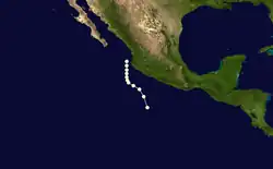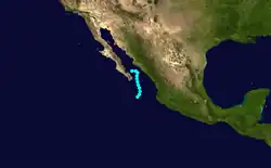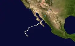 The tenth known storm of the season was identified on October 1 several hundred miles southwest of the tip of the Baja California Peninsula. Maximum winds observed during the storm's existence reached 85 mph (135 km/h); however, no air pressure was recorded. Initially tracking westward, the system turned northwest and later northeast by October 3. After a brief acceleration on October 4, the hurricane slowed as it neared the coastline of Baja California. Early on October 5, the storm crossed the Peninsula as a Category 1 hurricane before entering the Gulf of California. The hurricane made another landfall near Navojoa, Mexico later that day. Rapid weakening took place as the storm moved over the high terrain over northern Mexico. Early on October 6, the system transitioned into an extratropical cyclone over New Mexico before dissipating several hours later.[2]