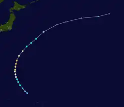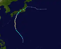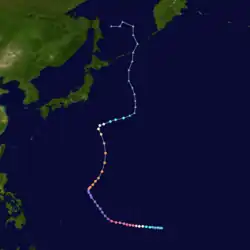 Tropical Storm Alice developed on July 14 in the open western Pacific Ocean. It moved to the northwest and attained typhoon status on the 16th. Alice rapidly intensified on the 19th to a 150-mile-per-hour (240 km/h) super typhoon, and after turning to the northeast it weakened. Alice hit southeastern Japan on the 22nd, and became extratropical on the 24th near the Kamchatka Peninsula.[5]