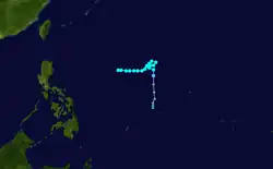 At noon on December 31, a vortex was noted along the Intertropical Convergence Zone about 1,300 miles (2,100 km) south of Hawaii. On January 7, the relatively small tropical storm struck Jaluit Atoll within the southern Marshall Islands, killing 14 people. It rapidly intensified, and reached winds of 140 miles per hour (230 km/h) the next day. Conditions became unfavorable, and steadily weakened to 105 miles per hour (169 km/h) winds. Ponape was struck on January 10, where Ophelia tore off the roof of the United States Weather Bureau office. On January 11, Truk was struck. The Weather Bureau's inflation shelter was destroyed, with other buildings on site severely damaged. On the 12th, favorable conditions allowed Ophelia to reintensify, reaching a peak of 160 miles per hour (260 km/h) on the 13th. Ophelia severely impacted Yap, removing the Weather Bureau office's sheet metal roof and damaging the inflation building, theodolite, and radio antenna.[1] After maintaining that intensity for 18 hours, it quickly weakened as it drifted northward, and dissipated on the 17th. Typhoon Ophelia caused widespread damage on several islands of the Western Pacific.[2] Ophelia also killed nine people when a USAF WB-50 crashed during a recon flight into the storm on January 15.[3]