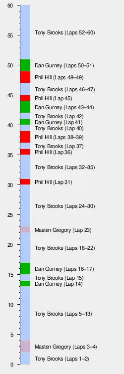 In a unique Formula One race format, first, second and third were all claimed by the same team, Scuderia Ferrari. British driver Tony Brooks won, ahead of American teammates Dan Gurney and Phil Hill. All three drove Ferrari Dino 246s.