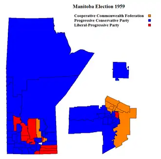 Roblin's PCs won 36 seats against 11 for the Liberal-Progressives, led by former Premier Douglas Campbell, and 10 for the social democratic Co-operative Commonwealth Federation led by Lloyd Stinson. The PCs took 25 percent more votes than it had received in the previous election just one year before but took 40 percent more seats than it had won in 1958. They had won 117,822 votes in 1958, compared to 147,000 in 1959.[1]