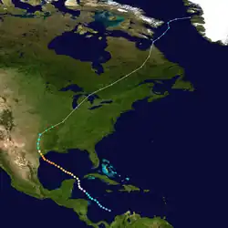 A tropical depression developed from an area of squally weather embedded within the ITCZ in the southwestern Caribbean Sea on September 3.[16] Initially a tropical depression, it strengthened slowly while heading northwestward, and by September 4, the system was upgraded to Tropical Storm Carla.[3] About 24 hours later, Carla was upgraded to a hurricane.[3][17] Shortly thereafter, the storm curved northward while approaching the Yucatán Channel. Late on September 7, Carla entered the Gulf of Mexico while passing just northeast of the Yucatán Peninsula. The cyclone reached major hurricane intensity around 12:00 UTC on the next day. Resuming its northwestward course, Carla continued intensification and on September 11, it peaked as a Category 4 hurricane. Carla made landfall near Port O'Connor, Texas, with winds of 145 mph (233 km/h). It weakened quickly inland and was reduced to a tropical storm on September 12. Heading generally northward, Carla transitioned into an extratropical cyclone on September 13, while centered over southern Oklahoma. However, the remnants continued generally northeastward and entered Canada on September 14, before dissipating near Cape Chidley early on September 16.[3]