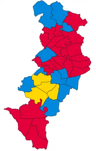 | Labour Party | 70,394 (42.8%) | 22 (57.9%) | 22 / 38