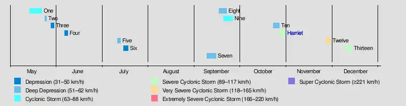 Harriet October 26–30 Severe Cyclonic Storm 100 km/h (60 mph) 990 hPa (29.23 inHg) Andaman Islands, East Pakistan, India, Malaysia, Myanmar, Thailand ≥$34.5 million ≥50,769