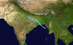 After making landfall in Thailand, the system continued westward, then curved to the northeast, probably regathering strength and making landfall near Chittagong in East Pakistan on October 30 before rapidly dissipating.[13]