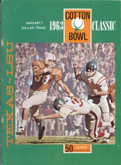 The 1963 Cotton Bowl Classic was the 27th edition of the college football bowl game, played at the Cotton Bowl in Dallas, Texas, on Tuesday, January 1. Part of the 1962–63 bowl game season, the game featured the fourth-ranked Texas Longhorns of the Southwest Conference (SWC) and the #7 LSU Tigers of the Southeastern Conference (SEC).[1] LSU shut out the Longhorns, 13–0.[4][5][6]