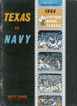 The 1964 Cotton Bowl Classic was the 28th edition of the college football bowl game, played at the Cotton Bowl in Dallas, Texas, on Wednesday, January 1. Part of the 1963–64 bowl game season, the game was a de facto national championship game, as both teams would be playing for the FWAA’s Grantland Rice Trophy.[4][3] The top-ranked and undefeated Texas Longhorns, champions of the Southwest Conference, defeated the #2 Navy Midshipmen, 28–6.[5][6][7][8]