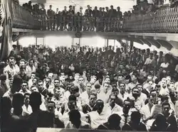 The event was attended by over 1,000 or 1,600 sailors.[g] In addition to sailors and marines, members of other military forces, such as the Guanabara Military Police and the Brazilian Air Force, were present, along with civilians,[105] including members of the Chamber of Deputies, union leaders, and journalists.[88] Paulo Schilling noted how "the unity of the left had been restored": prominent figures from various sectors attended and gave speeches, including members of the Communist Party, the General Workers’ Command (CGT), Popular Action, and the Women’s League.[105] Congressman Max da Costa Santos represented the Leonel Brizola's followers.[106] Paulo de Mello Bastos, Osvaldo Pacheco, Dante Pelacani, and Hércules Corrêa represented the CGT;[107] the latter was also a congressman and a communist.[108] Osvaldo Pacheco delivered a speech, claiming they could bring Brazil to a standstill.[105]
