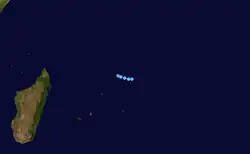 On January 7, Cyclone Denise passed north of Mauritius, producing wind gusts of 170 km/h (110 mph). Later, the storm crossed over Réunion, dropping record rainfall. Over a 24-hour period, Denise dropped 1,825 mm (71.9 in) of rainfall at Foc Foc, Réunion, of which 1,144 mm (45.0 in) fell over 12 hours; both precipitation totals are the highest recorded worldwide for their respective durations. Over 48 hours, precipitation totaled 2,230 mm (88 in) at Bras Sec. The heavy rains caused flooding that killed three people, and caused severe road and crop damage.[1][2][3]