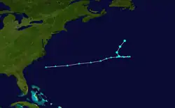 A cold front moved eastward from North America into the western Atlantic Ocean on August 28. An extratropical low developed on August 31 over the north Atlantic, which degenerated into a trough three days later. On September 4, another extratropical storm developed, located about 800 mi (1,285 km) south of Newfoundland. The system attained gale-force winds a day later, and turned westward on September 6, steered by a building ridge to the north. On September 7, the storm transitioned into a tropical storm, after its wind field became more symmetrical. Later that day, the storm attain winds of 60 mph (95 km/h), recorded by nearby ships. The storm turned to the east and northeast, crossing over its former path. On September 10, the tropical storm again transitioned into an extratropical storm, which later passed southeast of Newfoundland. The storm moved across the northern Atlantic Ocean, dissipating on September 13 southwest of Ireland.[4]