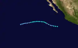 On June 4, a tropical depression formed 585 miles (941 km) southwest of Acapulco, Mexico Early the next day, the depression system intensified into the first tropical storm of the season and was named Victoria. At that time, the storm was at its peak intensity of 50 mph (80 km/h) which it retained while moving the northwest. Early on June 7, the tropical storm weakened into a tropical depression before dissipating six hours later. [1] In all, Tropical Storm Victoria stayed at sea.