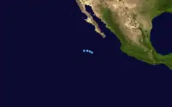 Six days after Joyce's dissipation, a tropical depression formed north of the Intertropical Convergence Zone on the evening of August 25.[8][9] The storm was then named Tropical Depression Sixteen-E. It took an extended amount of time, about three days before it intensified into a tropical storm.[10] The storm was designated as Tropical Storm Kirsten.[11]