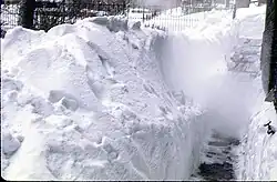 The Chicago blizzard of 1967 struck northeast Illinois and northwest Indiana on January 26–27, 1967, with a record-setting 23 inches (58 cm) snow fall in Chicago and its suburbs before the storm abated the next morning. As of 2025, it remains the greatest snowfall in one storm in Chicago history.[1][2][3][4] As the blizzard was a surprise during the day with people already at work or school, it stopped the city for a few days as people dug out. "The storm was a full-blown blizzard, with 50 mph-plus northeast wind gusts creating drifts as high as 15 feet."[3]