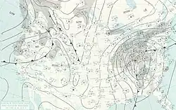 On Tuesday January 24, the maximum temperature was 65 °F (18 °C) but began to fall the next day with the passage of a marked cold front.[5][6] In fact, the front brought arctic air from a strong 1032 mb high pressure center over the southern Canadian Prairies. By the morning of January 25, the mercury had dropped to 31 degrees F.