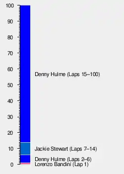 Meanwhile, Hulme continued to lead the race to the finish unchallenged. With just eight laps to go, Amon suffered a puncture and dropped to third, with second going to Hill.[3][4] Three of the top four finishers (Hulme, Amon and McLaren) were New Zealand drivers - 30% of the total number of New Zealand drivers (10) who have started a Formula 1 World Championship Grand Prix.[6]