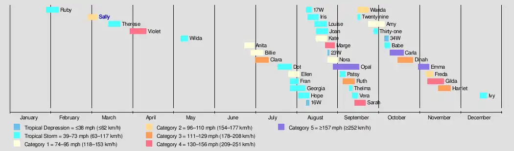 In 1967, the number of storms that the Japan Meteorological Agency considered "typhoons" was the record number (39).[1] However, the JTWC only considers 35 storms to have formed during the season, beginning with Ruby in January. Out of those 35 storms, 20 intensified to category 1-equivalent typhoons, 5 of those further strengthening to super typhoons.