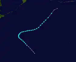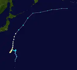 A tropical depression formed in the western Pacific on July 27. Over the next 48 hours, it tracked west-northwestward, intensifying into a tropical storm by July 29. This early phase featured steady organization, with central pressure dropping to 989 hPa by July 30. Georgia reached its peak intensity on August 1–2, with maximum sustained winds of 60 knots (110 km/h) and a central pressure of 982 hPa. The storm then executed a gradual northeastward recurvature east of the Bonin Islands. By August 2, it accelerated toward higher latitudes, maintaining tropical storm strength.
