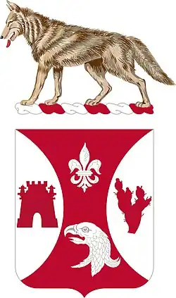 • Shield: The cactus is derived from the coat of arms of the 125th Field Artillery, the 109th and the 110th Engineers; the fleur-de-lis, from that of the same organizations; the eagle's head, from the 110th Engineers; and the castle, from the 125th Field Artillery. This arrangement indicates descent from all organizations, using the colors of the Engineer Corps representing original approval of the design as an Engineer unit.