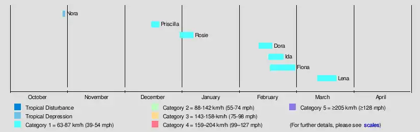 | Priscilla | December 15 – 19 | Category 1 tropical cyclone | 75 km/h (45 mph) | 990 hPa (29.23 inHg) | Fiji | Minor | Unknown | [3] |