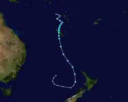During December 15, a small tropical depression developed about 278 km (175 mi) to the north of Yasawa-i-Rara in Fiji's Yasawa Islands.[1] Over the next day, the system drifted westwards, before it started to move southwards and intensify further.[1] The system subsequently became equivalent to a modern-day category 1 tropical cyclone, with 10-minute sustained wind speeds of 75 km/h (45 mph) during December 17.[1][2] During that day, the system passed about 95 km (60 mi) to the west of Nadi and started to move south-eastwards and passed well to the south of Ono-I-Lau during December 18.[1] The system was last noted during the next day, after it had moved below 25S and out of the tropics.[1] It was thought that the system caused gale-force winds in parts of Viti Levu, Vatulele, Kandavu and the Yasawa and Mamanutha group of islands.[1]