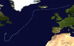 Toward the end of November, a cold front moved across the Atlantic Ocean, generating an extratropical storm near Bermuda on November 25. Thunderstorms developed near the center as the system's wind field contracted. On November 27, the storm turned southward toward warmer waters and gradually dissociated itself from the cold front. On November 28, it transitioned into a subtropical storm, as its convection evolved into a comma-like structure. At that time, the system had peak winds of 65 mph (100 km/h). On November 29, the storm turned to the northeast ahead of an approaching cold front. A day later, the system transitioned into a tropical storm, by which time it was a small, well-organized cyclone with convection over the center. Late on December 1, the storm became extratropical again as it became embedded within the cold front. It intensified while accelerating over the north-Atlantic, attaining winds of near hurricane-force. After turning eastward, the powerful extratropical storm passed south of Iceland on December 4, and north of the United Kingdom a day later. The circulation dissipated on December 6 while near Scandinavia.[21]