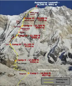 | Camp I | 16,000 | 4,900 | 2 April | on "rognon" (island of rock in glacier)[46] |