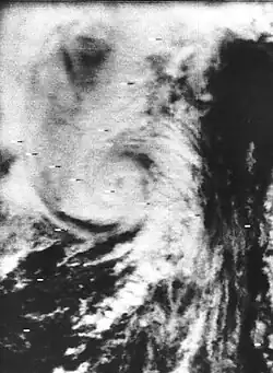 On October 11, 1970, satellite images indicated that a tropical depression developed north of Hispaniola.[1] However, according to post-analysis, a subtropical depression actually formed on October 12 at 1200 UTC. The depression slowly intensified over the next few days, and became a subtropical storm on October 12, thought this was operationally unnoticed by the National Hurricane Center.[2] By October 13, satellite imagery indicated that convection associated with the depression merged with a weak stationary front. As a result, the National Hurricane Center no longer considered it purely tropical and classified the system as a "subtropic storm" on October 14.[1] Later that day, the National Hurricane Center began issuing special bulletins for the storm, indicating the possibility of the system acquiring tropical characteristics.[3]