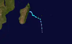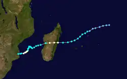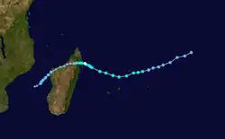 Hermione existed from March 1 to March 11. On March 5, Hermione passed north of the Mascarene Islands, producing heavy rainfall on Réunion that reached 757.5 mm (29.82 in) at Foc Foc.[7]