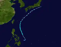 During January 8, the JMA started to monitor a tropical depression that had developed, about 500 km (310 mi) to the east of Ngerulmud, Palau.[3] Over the next day the system gradually developed further as it moved north-westwards, before it was classified as a tropical storm and named Sarah by the JTWC, after a US Navy plane had found an organised system.[3][4] The system subsequently recurved north-eastwards, before it was classified as a Severe Tropical Storm by the JMA during January 10.[5] During that day, the JTWC reported that the system had peaked, with 1-minute sustained wind-speeds of 95 km/h (60 mph).[4] Over the next day, the system quickly weakened and became an extratropical cyclone during January 11.[4] Sarah's extratropical remnants were subsequently tracked as they moved north-eastwards, until it made landfall on Canada and broke up over the mountains of British Columbia during January 17.[4]