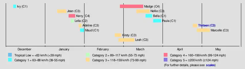 The next system, Cyclone Leah, formed near the coast of Western Australia on 27 February. Moving southwestward, Leah eventually dissipated on 11 March.