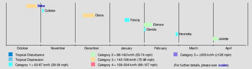 Felicity January 14 – 18 Category 1 tropical cyclone 75 km/h (45 mph) 990 hPa (29.23 inHg)