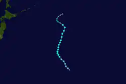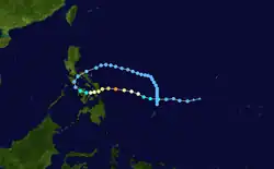 A tropical disturbance generated by an upper tropospheric low in the mid-Pacific trough moved westward through the Caroline Islands, slowly organizing into Tropical Depression 1W on January 5. The depression quickly strengthened, reaching tropical storm status later that day and becoming a typhoon on the 6th as it neared the Philippines. Kit rapidly intensified on the 6th and 7th to a 140 mph (230 km/h) typhoon, the strongest ever in January, but its inflow was cut off to the west, weakening the typhoon as it continued westward. Kit hit the eastern Philippines as a 100 mph (200 km/h) typhoon on January 7, and turned north through the archipelago in response to a break in the subtropical ridge. This brought Kit eastward then southward, where after completing its large loop it dissipated on January 15, just 170 nautical miles (310 km) from its starting location.[2]