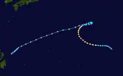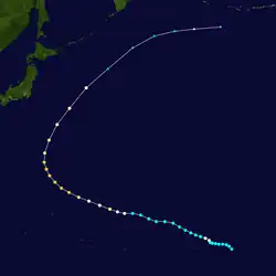 A tropical disturbance emerged from the ITCZ on July 29 and passed through the Marshalls. It became a tropical depression on July 30 and a tropical storm the next day. It and headed in the direction of Japan. Alice became a typhoon on August 2 and reached its maximum intensity on August 4 while southwest of Marcus. As Alice continued approaching Japan, it steadily weakened. It recurved, brushed Honshu, and went extratropical on August 8. It never made landfall.[10]