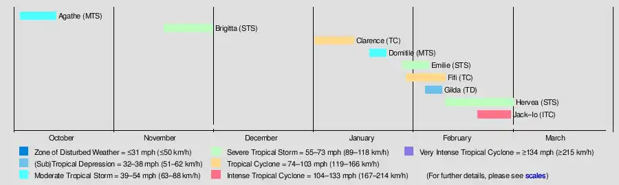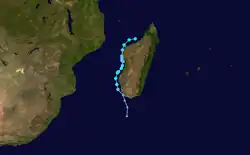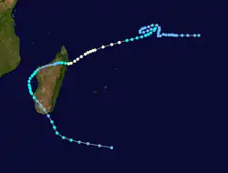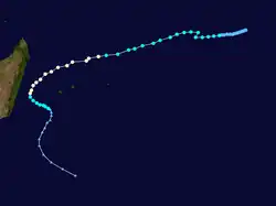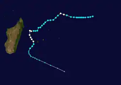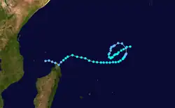 On January 8, Clarence passed near St. Brandon, producing high waves that destroyed four boats and several homes. Wind gusts on the island reached 169 km/h (105 mph). For several days moved in a counterclockwise track around the Mascarene Islands, producing high waves and beneficial rainfall on Réunion.[2]