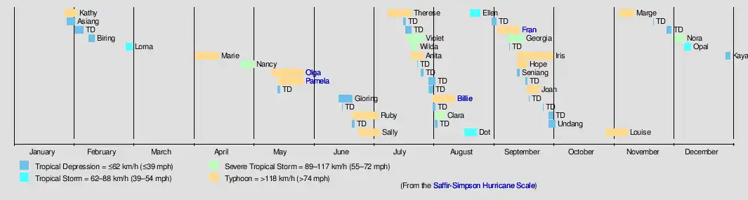 Western North Pacific tropical cyclones were named by the Joint Typhoon Warning Center. The first storm of 1976 was named Kathy and the final one was named Opal.