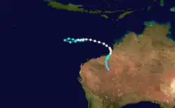 Cyclone Vern formed on 27 January from one of several low pressure centres within a trough that extended from the Cocos Islands eastward across northern Australia to Queensland. Over the period of a couple days, the strong northwesterly monsoonal flow to the north of the trough interacted with the strengthening easterly winds of a high-pressure area moving into the Great Australian Bight. As a result, one of the lows rapidly deepening into a tropical cyclone off the Kimberley coast. After initially moving tracking westward out to sea, the storm executed an anticyclonic loop and proceeded to move eastward. Then, early on 31 January, while located about 250 km (155 mi) northwest of Broome, Vern took a sharp turn toward the southeast then south. It continued in that general direction until it made landfall near Anna Plains at about 03:00 GMT, 1 February, with winds of about 145 km/h (90 mph). Inland, the system tracked southwestward then to the south again, causing flooding and minor damage, before dissipating on 3 February over the Pilbara.[1]